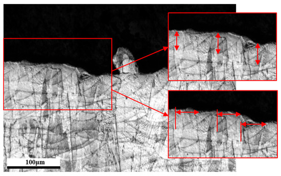 In this research, a Design of Experiments (DOE) was formulated consisting of 30 LPBF CM247LC variants that were fabricated across two separate build plates. One build plate was left in the AB condition, whilst the other set of samples was subjected to a series of HIP’ing/HT cycles. The AB samples were prepared through a series of metallographic procedures as shown in Table 2 and etched using a high concentration Kallings Reagent (5 g CuCl2, 100 mL HCl, 100 mL ethanol). A semi-empirical approach to melt track analysis was conducted across all 30 variants, with 50–70 manual measurements conducted for both height and width at the surface of the material. These measurements were taken with the procedure depicted in Figure 1, where melt track height is taken as the distance from the minimum point of the solidified melt pool to the surface of the material, and width is taken as the distance from the minimum point of the solidified melt pool to where the circumference of the melt pool intersects the surface, and then doubled.