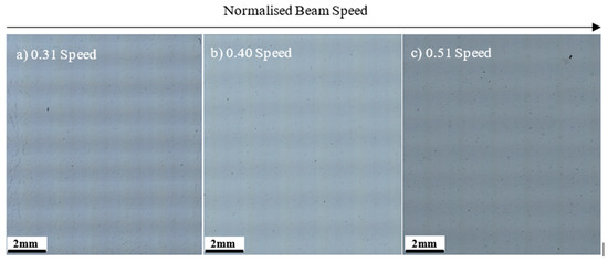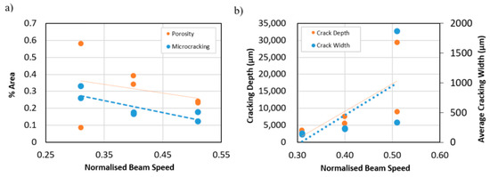 Finally, an investigation into the influence of normalised process parameters such as beam speed and power on mechanical properties was conducted as shown in Figure 15. Here, a series of Vickers Hardness measurements was recorded, and the results demonstrated that there is a direct linear trend between energy density and average hardness, as the indirect relationship between normalised beam speed and normalised beam power is further emphasised. It can be seen that these trends contradict that of the material’s porosity and microcracking prominence and as such this suggests that the material’s hardness is dominated by microstructural features such as grain size.