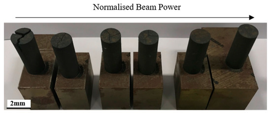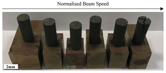Figure 7 shows the implications of normalised beam speed on tearing induced as a consequence of HIP’ing. A linear relationship is observed where, as beam speed increases, the severity of macrocracking increases substantially. The main hypothesis used as an explanatory factor for the inverse relationship observed between microcracking and macrocracking is that it acts as a stress reliever to residual stressing caused through exceptionally high cooling rates, thus explaining why AB materials which appear to have low levels of microcracking tend to crack more severely post HIP. The influence of normalised beam speed on the severity of macrocracking is further illustrated in Figure 7, with the image providing an indication as to the increasing magnitude of fracture observed in accordance with the increasing normalised beam speeds (from left to right).