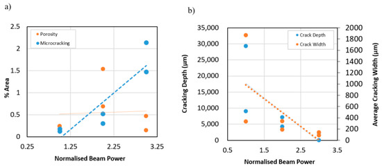 Influence of normalised beam power on (a) microcracking and porosity in the AB state; (b) cracking post HIP.