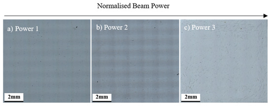 Stitched and blended high-resolution images of material discontinuities in the AB state in relation to normalised beam power.
