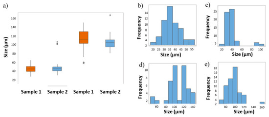 Melt track height and width variance for paired parameter samples 1 and 2, (a) box plot representation (b) sample 1 track heights; (c) sample 2 track heights; (d) sample 1 track widths; (e) sample 2 track widths.
