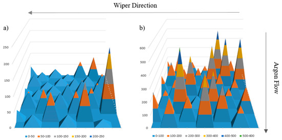 With variations in track heights and widths being attributed to differing tearing behaviours despite the same parameter sets, an investigation as to the cause takes precedence. As displayed in Figure 12, contour mapping utilising track variance highlights a phenomenon that is self-evident towards the back-right area of the build plate. These peaks are attributed to regions of disrupted argon gas flow and gas trappage due to the proximity of the recoating mechanism and, as such, non-uniform cooling becomes prominent. Therefore, the variations in track sizes observed are believed to be a consequence of the wiper recoating at the end of each layer.