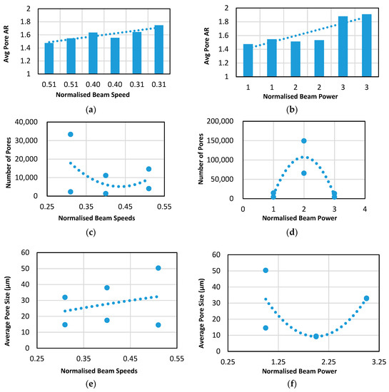 As mentioned previously, the existence of a polynomial relationship for porosity calculations was observed and it was therefore hypothesised that area percentage is somewhat limited and does not give an indication as to the mechanisms or characteristics of these pores. As such, an in-depth analysis of porosity in relation to process parameters has been conducted, with multiple criteria such as average porosity size, aspect ratio and count all being considered. As shown in Figure 13a,b, there is a linear relationship and correlation between beam speed and power and the melt track aspect ratio. This becomes particularly important in regard to AM specific defects such as keyholing, where high AR pores can skew beam dynamics and lead to the remelting of previous layers. Furthermore, a polynomial relationship further exists with regard to the number of pores, where the mid region of beam speed appears to give rise to the least number of pores, whereas beam power again shows an inverse relationship, where porosity count peaks within the mid region of beam power. With regard to pore size, there tends to be a linear relationship between beam speed and average size, whereas with beam power the same polynomial relationship arises inversely proportional to that of the number of pores.