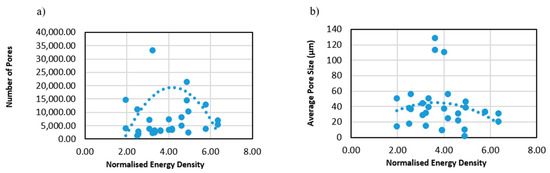 Influence of normalised energy density on (a) number of porosity sites and (b) average porosity size for all 30 laser powder bed fusion (LPBF) variants.