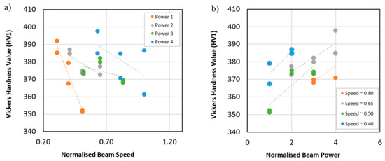 Influence of (a) normalised beam speed and (b) normalised beam power on average hardness values.