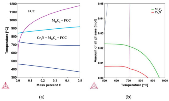 Heat treating austenite results in significant microstructural changes in the temperature ranges 500–900 °C that depend on the chemical composition, grain size and the exposure time. Precipitate phases nucleate on the high energy regions like the grain boundaries and grow. A phase diagram for the studied material calculated with the help of Thermo-Calc is presented in Figure 2a. For 0.1 wt.% C, the equilibrium phases in the sensitization temperature regime are austenite, M23C6 and Cr2N. All these phases have been observed in the microstructures of the different heat treatment conditions used in this work. The property diagram in the Figure 2b shows the equilibrium number of moles of the phases in 100 g of alloy as a function of temperature. At the considered temperature 820 °C, Thermo-Calc predicts the presence of chromium carbide (M23C6) and chromium nitride (Cr2N) and austenite under equilibrium conditions.