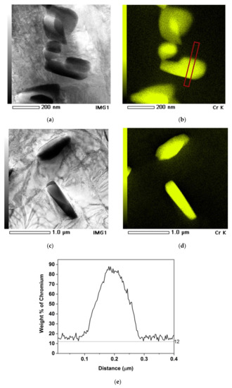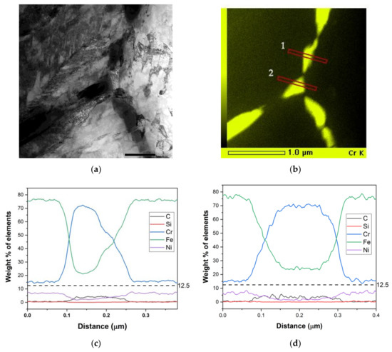 Sample 72 μm/ 820 °C-120 h. (a) Bright field transmission electron microscope (TEM) micrograph showing M23C6 carbides along a grain boundary. (b) EDS mapping of Cr. (c,d) Concentration profiles along lines 1 and 2 in the Cr EDS map.