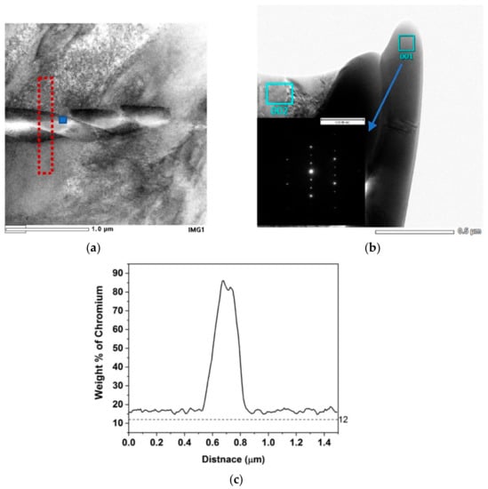 Sensitized microstructures have been well characterized previously [33,34]. The precipitation of M23C6 carbides occurs mainly on random high-angle grain boundaries and their size and spacing vary from boundary to boundary. From the TEM results of the self-healed sample shown in Figure 4, Cr depletion is observed in the vicinity of grain boundary M23C6 carbides but the Cr content did not go below 12 wt.%. This is also the case for intragranular M23C6 carbides shown in Figure 5. In the samples where sensitization is prevalent, Cr concentrations have been found to go below 12 wt.% [35].