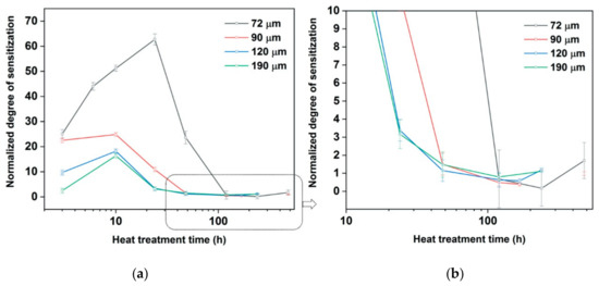 Figure 7 shows normalized DOS values (NDOS) obtained from the DL-EPR test results on the samples heat treated for various times. The normalization of the DOS values was done using average grain size obtained from the mean ECD grain sizes as described above. It can be seen that even after normalization, which compensates the reduction in the specific grain boundary length as grain size increases, an increase in grain size generally leads to a lower normalized degree of sensitization during both the sensitization and self-healing phases. The ST sample with a grain size of 72 μm became highly sensitized with a high peak DOS. As the C content is lower in large grained samples, the C available for M23C6 formation is lower and thereby lower peak NDOS values are observed in these samples. Also, with decrease in C content, the nose of temperature-time-sensitization diagram shifts towards right and to lower temperatures [10,31]. So, the temperature at which peak NDOS can be observed will be lower for the sample conditions 90–190 μm. This is the reason for the decrease in NDOS with an increase in grain size from 72–190 μm.