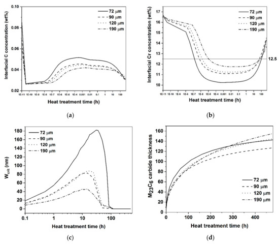 Nevertheless, the model is quite good at predicting the trends of the measured NDOS values for the conditions considered. Regarding the effect of heat treatment time at 820 °C on the sensitization and self-healing kinetics, Figure 11 shows that the predicted NDOS values follow the same trend as the experimentally measured values. The peak NDOSpredicted is in accordance with the experimentally measured NDOS values. The higher peak NDOSpredicted has been observed in 72 μm with higher C content. The available C for the precipitation of M23C6 carbide is lower in the case of samples with lower C content. It can be seen from Figure 10b,c after 3 h heat treatment, Crint is higher and Wcrit lower in the 190 μm sample than the 72 μm sample. This is due to the lower C content of the 190 μm sample leading to thinner grain boundary carbide, see Figure 10d. The variation of Crint and Wcrit controls how the DP changes and affects the predicted NDOS. In Figure 10b, when Crint reaches above 12.5% Cr, implies the sample condition is completely self-healed.