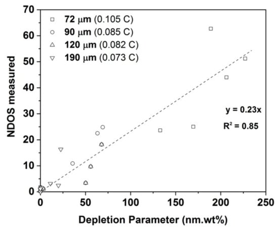It can be observed that with an increase in grain size and reduction in carbon content the time to reach the peak NDOS is reduced. Figure 7b shows that after heat treating the samples with mean grain sizes 120 and 190 μm for 240 h, a small increase in NDOS is observed. However, the increase is small compared to the scatter in the measured values.