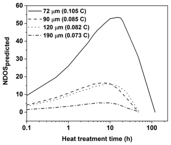 A good correlation between measured NDOS values and DP was only found when da was considered to be 1/6th of the average grain ECD and not if it was taken to be the full average grain ECD or half of the average. This supports the earlier assumptions regarding da made by Sourmail [29] and Kolli [30]. The approach is based on the idea that grains are taken as cubes with six faces making it appropriate to attribute to each calculation volume a sixth of the grain diameter from which C and Cr can be drawn. The predicted NDOS has been plotted with heat treatment time in Figure 12. It can be seen that the peak NDOS along with the time to reach peak NDOS are decreasing with increase in grain size and decrease in carbon content. The calculated NDOS values follow the similar trend to the measured NDOS values from Figure 7.