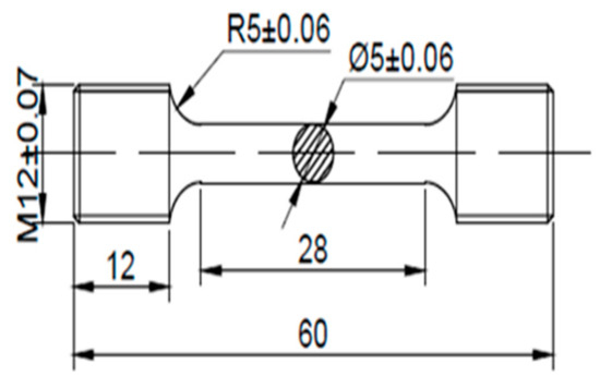 The specimens were obtained from a 14Cr1MoR plate; the chemical composition is shown in Table 1. The chemical composition was confirmed with an ARL-4460 direct-reading spectrometer (Thermo Fisher, Woburn, MA, USA). The normal working temperature of 14Cr1MoR was below 550 °C. Therefore, a longer time was required to achieve a completely spheroidized microstructure due to the low spheroidization rate in the given temperature range. Lee et al. [20] reported that pearlite spheroidization occurs below AC1 temperature, which corresponded to the initiation of the austenite phase, and the spheroidization rate increased with the increase in temperature. In this study, 14Cr1MoR steel was aged at 680 °C to accelerate the pearlite spheroidization. One should note that the given temperature was lower than the AC1 temperature and higher than the normal working temperature. The maximum aging time was set at 100 h. After thermal aging, the 14Cr1MoR steel samples were water-quenched to avoid phase transformation. After polishing and etching in 4% Nital solution, the microstructure was observed using TESCAN VEGA 3 SEM (Tescan, South Moravia, Czech Republic) and FEI TecnaiGF30 TEM (Thermo Fisher, Woburn, MA, USA). The Instron 8801 testing machine (Instron, Shanghai, China).was used to assess the tensile properties with a test standard of GB/T228.1-2010. The geometry of the sample is shown in Figure 2. The strain rate was set as 1 mm/min. The HRC hardness was tested using an HR5-150 Rockwell hardness tester (Jiu bin, Shanghai, China).