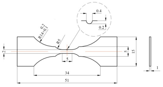 The in situ tensile test was performed with a micro-static–dynamic testing machine (Shimadzu, Tokyo, Japan) and a scanning electron microscope, which was dedicated for in situ SEM observations. The maximum load of the testing machine was 1000 N. The geometry and dimensions of the specimens are shown in Figure 3. To observe the crack initiation during the test, a U-shaped notch with a depth of 0.2 mm was designed by wire-cutting one side of each specimen, as shown in Figure 3. Then, the samples were polished and etched in 4% Nital solution for microstructure observations. The deformation rate was set at 0.001 mm/s.