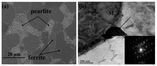 The microstructure of as-received 14Cr1MoR steel. (a) SEM and (b) TEM images, where the inset in (b) shows the selected area electron diffraction (SAED) pattern of the M23C6 phase.