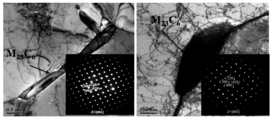 As shown in Figure 4a, the as-received 14Cr1MoR steel mainly consisted of ferrite, pearlite, and a small number of particles which were distributed along the grain boundaries of ferrite. TEM images and a selected area electron diffraction (SAED) pattern of particles that were distributed along grain boundaries are presented in Figure 4b. The SAED pattern confirmed that the distributed particles belonged to the M23C6 phase, which is a stable carbide phase. One should note that a small amount of M23C6 phase can improve the hydrogen corrosion resistance at high temperatures.