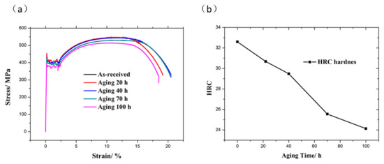 Figure 7 shows the mechanical properties of 14Cr1MoR steel samples after different aging times at 680 °C. Room-temperature tensile characterizations of 14Cr1MoR steel samples were carried out after aging at 680 °C for different lengths of time, as shown in Figure 7a. The results show that the yield strength and tensile strength decreased with an increase in the degree of spheroidization damage (i.e., increased aging time). The HRC hardness of spheroidization-damaged 14Cr1MoR steel samples exhibited a similar trend to the yield strength and tensile strength trends.