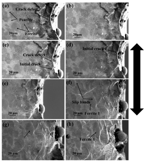 Moreover, the initially observed slip bands were aligned in only one direction, indicating the activation of one dominant slip system. With continued deformation, the fine slip bands became coarser and multiple slip bands were observed in front of the initial crack, indicating the dominance of the cross-slip deformation mechanism. In addition to the appearance of the slip bands within grains, the morphology of the ferrite grains also changed during deformation. Though the ferrite grains were gradually elongated, the pearlite and granular carbides kept their morphology until the stress reached a threshold limit. A large concentration of stress at the softer/harder phase interface caused by deformation in the softer phase may cause coordinating deformation to occur in the harder phase [24,25,26].