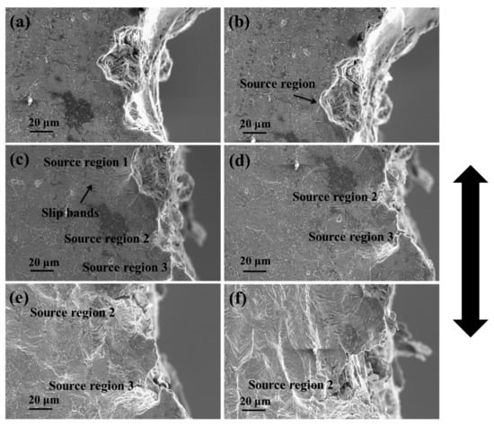 Figure 9 presents the microstructural evolution of 14Cr1MoR steel after complete spheroidization damage under different tensile loads. The original microstructure is shown in Figure 9a, where the ferrite grains were approximately equiaxed and the carbides were mainly distributed along the ferrite grain boundaries. When a tensile load of 490 N was applied, a crack source region was observed near the notch, which was also presented in the ferrite matrix (Figure 9b). When the tensile load increased to 600 N, two new crack source regions appeared at the notch. To distinguish these source regions, the three crack source regions were named Source region 1, Source region 2, and Source region 3. In front of crack source regions, the slip bands appeared in several ferrite grains without any distinct morphological transformation. Moreover, the parallel slip bands indicated the activation of only one slip system, as shown in Figure 9c. With greater tensile load, the morphology of the crack source regions, i.e., Source region 2 and Source region 3, exhibited significant changes, such as crack widening and stretching. However, in front of the tip of the crack, the slip bands remained coarser and uninterrupted by ferrite grain boundaries. The slip bands bypassed the grain boundaries of the granular carbides and continued to expand into the neighboring ferrite grains, as shown in Figure 9c–f. When the load exceeded the maximum force and then decreased to 660 N, the crack present in Source region 2 became the main crack and rapidly propagated until failure.