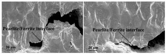 - With the increase in strain, the high-strength ferrite/pearlite interface inhibited the movement of slip bands. The concentration of stress at the crack tip cracked the ferrite/pearlite interface and facilitated crack propagation along the ferrite/pearlite interface.