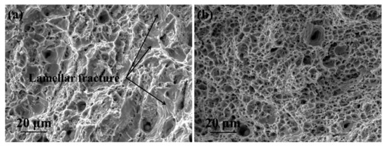 The fractured morphologies of the as-received and completely spheroidized 14Cr1MoR steel samples are presented in Figure 12. The as-received sample exhibited dimples and wavy regions of lamellar fracture, as shown in Figure 12a, where the dimples originated from micro-voids that coalesced in the ferritic regions. The lamellar fracture was exhibited in the pearlite region, which indicated the nucleation and propagation of the crack along the junction of the different pearlite colonies. The lamellar fracture in the pearlite regions was responsible for the higher tensile strength of the as-received 14Cr1MoR steel. As shown in Figure 12b, the fracture surface of the completely spheroidization-damaged 14Cr1MoR steel was occupied by dimples, which could be ascribed to the failure mode involving coalescence of the micro-voids (Figure 11).