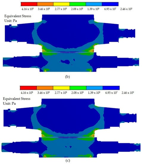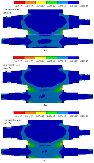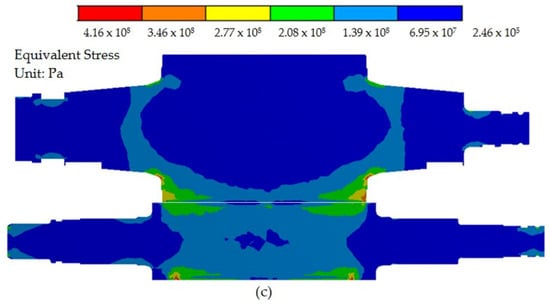 Stress distribution for combinations of crown: (a) combination 4, (b) combination 5, and (c) combination 6.