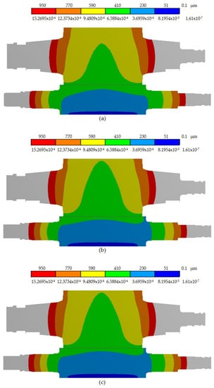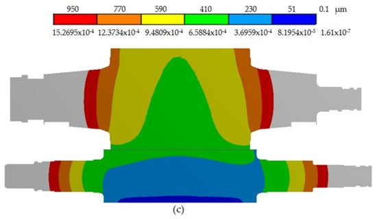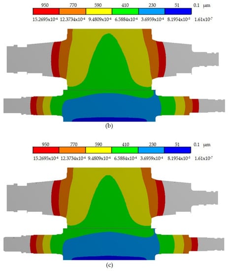 Roll deflection distribution for combinations of crown: (a) combination 7, (b) combination 8, and (c) combination 9.