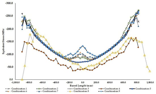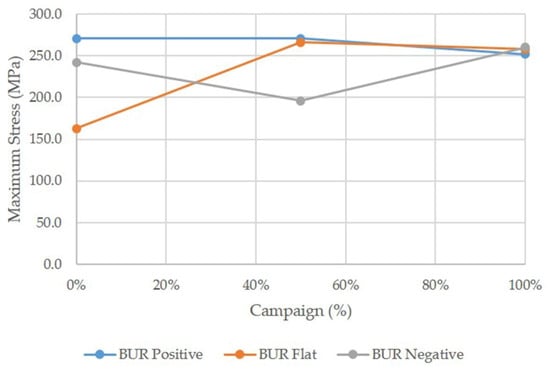 Graph of the stress distribution curves for all mechanical contact combinations analyzed on BUR.