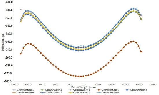 Roll deflection distribution for combinations of crown: (a) combination 1, (b) combination 2, and (c) combination 3.