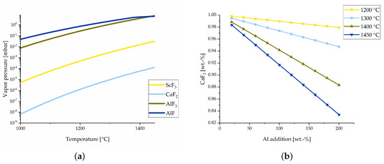 (a) vapor pressures of selected fluoridic compounds; (b) calculated CaF stability relative to the weight fraction of Al added at different temperatures.