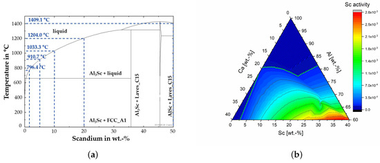 (a) calculated Al-Sc binary phase diagram up to 50 wt.-% Sc; (b) calculated Sc activity in the Al-rich corner of the ternary Al-Sc-Ca system at 1400 C. The highlighted region indicates the range in which Sc activity is below the critical threshold.