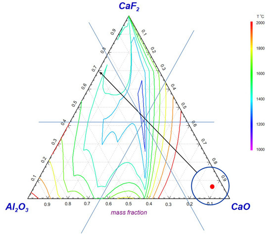 Ternary oxyfluoridic phase diagram CaF-AlO-CaO with isotherms. The arrow depicts the slag design strategy to minimize the liquidus temperature originating from the non-fluxed system as indicated by the dot.