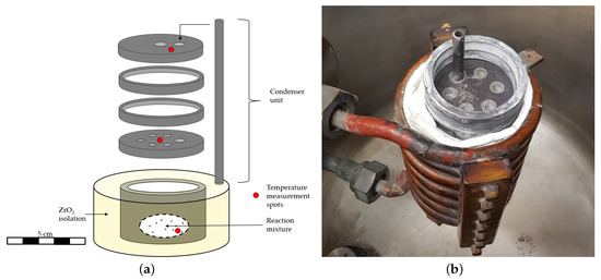 (a) schematic setup inside the induction coil; (b) real setup viewed from above without a condenser top.