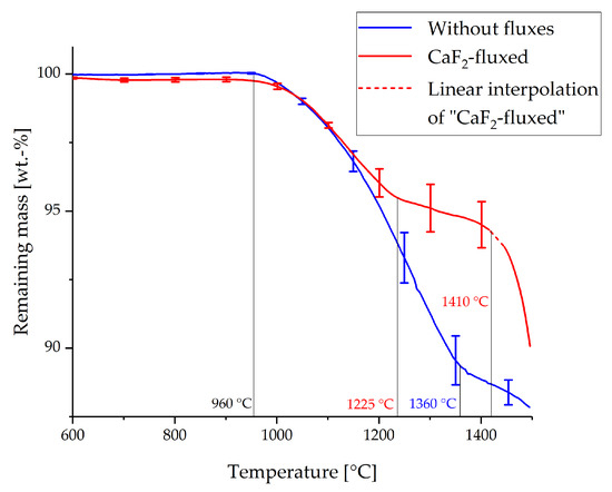 TG analysis of the co-reduction mixture without fluxing (blue) and with CaF as flux (red).