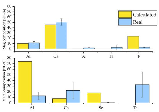 The Sc content in the slag was found to be higher than expected, with 2.12 wt.-% on average. With Al and Ca corresponding well to the calculated versus the experimental concentrations, F is present at far lower contents than expected by thermochemical modelling. A slight Ta pick-up from the crucible is also observed. On the other hand, Al and Sc concentrations in the metal machined from the crucible are far below the expected range, whereas Ca and Ta contribute mostly to the metallic phase (Figure 6).