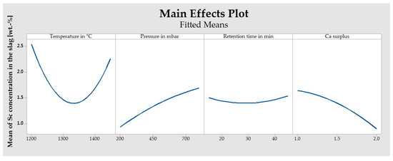 The main effects contributing to the final Sc concentration of the oxyfluoridic phase are shown in Figure 7. Temperature dependency is indicating a minimum Sc slag content at 1330 C; lower pressures are favorable for low Sc concentrations. While the retention time does not have a severe impact on the Sc content, high calcium surpluses have similar impact as low pressures.