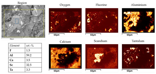 Metal phase SEM-EDS mapping and spectral analysis on O, F, Al, Ca, Sc and Ta.