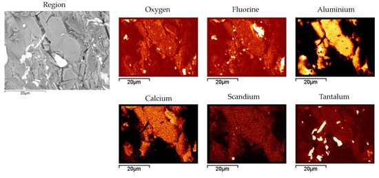 For the slag samples, the mapping indicates the formation of an oxyfluoridic slag as O and F are found with similar intensities in the same regions. The slag is containing Al and Ca, as well as minor Sc and Ta concentrations, where the latter may be attributed to crucible wearing. Regions with higher Ca and F concentrations are found that are corresponding to the presence of CaF.
