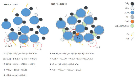 With regard to the differences between ICP/IC analysis and the calculated concentrations of Al and F especially, a mechanism for the removal of these elements from the system is the most probable explanation (Figure 10). Therefore, CaF has to be converted into a different compound with F evaporation in a volatile compound. As shown in Figure 10, we propose a reaction path where volatized Ca gas reduces primarily AlO at temperatures exceeding the evaporation point of Ca (Reaction step 1). Liquid Al is therefore available for subsequent reduction of ScF (Reaction step 3) and the conversion of CaF to CaO in conjunction with AlO (Reaction step 6). At temperatures above the liquidus temperature of the slag (Reaction step 7), the formation of the liquid phases decelerates the evaporation rate substantially.