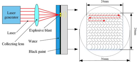Laser shock peening was performed in the axial direction at the region of a 24 × 24 mm2 by laser shock peening complete equipment (YS80-M165, Xi’an Tyrida Optical Electric Technology Co, Xi’an, China). The wavelength, maximum output energy, and pulse duration of the laser were 1064 nm, 8 J, and 20 ns, respectively. Table 2 exhibits detailed parameters of the experiment. The laser shock peening areas need to be covered with two different layers. The ablative layer, adhered to the material surface, is black paint. And the constraint layer, attached to the black paint, is water flow with a thickness of 1 mm. Laser beams from the laser generator irradiate and focus on the black paint on the surface material at a pulse duration of 20 ns and a light spot diameter of 4 mm. Lacquers absorb the laser energy and gasify to produce plasma in a short period. Afterward, plasma continues to absorb energy before the end of the pulse time and creates an explosive shock wave. Finally, the shock wave generates plastic deformation on the surface of the material under the action of the restraint layer. Figure 1 depictes the schematic diagram of laser shock peening and the pattern of the laser impact path.