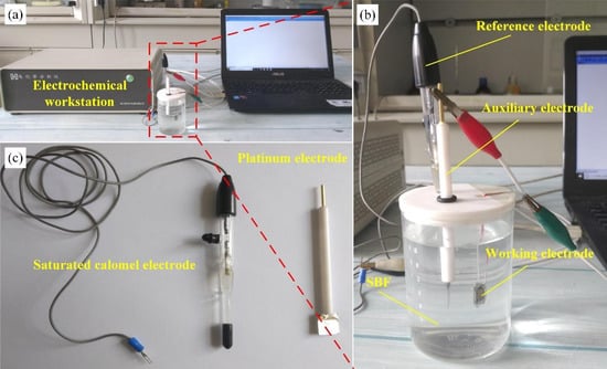 The electrochemical characteristics of samples with different laser power densities in the SBF solution were investigated by an electrochemical workstation (CHI604E, Shanghai Chenhua Instruments Co., Ltd., Shanghai, China) at 37 ± 0.1 °C. Figure 2 shows the physical connection diagram of an electrochemical workstation. This experiment applied the classical three-electrode system. A saturated calomel electrode was used as a reference electrode, the platinum plate was used as an auxiliary electrode, and the specimen was used as a working electrode. Before the experiment, all specimens were cut into standard cube samples with a dimensions of 10 mm × 10 mm × 5 mm. An aluminum conductive strip was glued to the back of each sample. Simultaneously, the working surface was required to be exposed to SBF solution, and other surfaces were fully wrapped by Kraft silicone rubber to minimize unforeseen effects. Then, we put the connected device in Figure 2 into a constant temperature water bath and kept it at 37 ± 0.1 °C for 30 min to eliminate some external interference and stabilize the open circuit potential. Afterward, the potentiodynamic polarization curve was measured with a scan rate of the tests of 10 mV/s. Meanwhile, to obtain a relatively complete polarization curve, the initial electric potential and final electric potential were set to −1.6 V and −0.9 V, respectively. The analysis software recorded experiment data. Corrosion current density (Icorr) and corrosion potential (Ecrro) were calculated according to the polarization curve by software (CHI604E Electrochemical Analyzer, version 15.03, 3700 Tennision Hill Drive Austin, Austin, TX, USA).