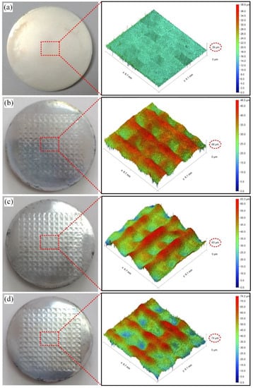Figure 3 displays the macroscopic features and 3D morphology on the surface of the samples before and after laser shock peening. As can be seen intuitively in the picture, the surface of the untreated sample is relatively flat, while there are many small dents on the surface of the LSP samples, and the plastic deformation is visible. The peak-to-valley value is one of the surface integrity parameters. Within the parameters studied, there is a distinct tendency of augmenting with the laser power density increment in terms of peak-to-valley value. Besides, roughness is another crucial surface integrity parameter. The surface roughness of the untreated sample was 0.2 µm. However, the surface roughnesses of samples treated by laser using parameters of 1.19 GW/cm2, 1.99 GW/cm2, and 2.79 GW/cm2 were 2.39 µm, 5.68 µm, and 6.11 µm, respectively.