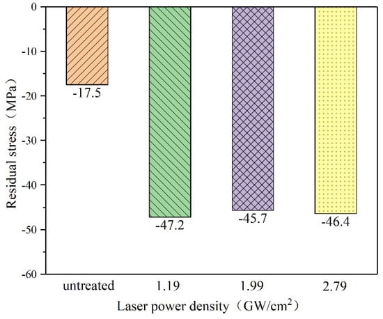Figure 4 represents the average residual stress values for the four sample surfaces. Based on information conveyed from the picture, the magnitude of the residual compressive stress can be ranked as follows: 1.19 GW/cm2 > 2.79 GW/cm2 > 1.99 GW/cm2 > untreated sample. Generally speaking, the values of residual compressive stress between three treated samples are a little different. The residual compressive stress does not increase with the increase of laser power density. It reaches saturation and stabilizes around –46 MPa. Residual compressive stress is enhanced by a maximum of 1.7 times compared with the original sample. It can be explained that the residual compressive stress will decrease when the shock wave load exceeds 2.5VHEL (Hugoniot elastic limit) []. Samples by laser shock peening obtained the higher residual compressive stress compared with the untreated samples, but not by much. Possible reasons can be demonstrated in Figure 5. On the one hand, extruded magnesium alloy was chosen as the raw material in this study. As depicted in Figure 5a,b, the internal grains were subjected to radial pressure in the manufacturing process, and the plastic deformation in the radial circumference produces a hardening layer and induces residual compressive stress. The grains in the plastic deformation zone make the grains with internal elastic deformation bear radial compressive stress and axial tensile stress. Thus, the grains on the upper surface bear compressive stress. Therefore, the original magnesium alloy ZK60 shows the residual compressive stress value of −17.5 MPa.