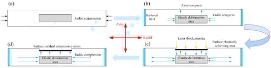 Schematic diagram of the internal stress state of materials before and after laser shock peening: (a) during extrusion; (b) end of extrusion; (c) during laser shock peening; (d) end of laser shock peening.