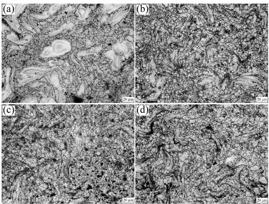 Figure 6 shows the changes in optical microstructure before and after laser impact. It can be seen from Figure 6a that the size of grains on the surface of the untreated sample is not uniform. It can be observed that there are many large grains in which the scale ranges from 50 μm to 70 μm. Furthermore, the surface grains are refined after laser impact, and the number of grain boundaries increased. To be more exact, according to the results of metallographic analysis software, the average areas of the grains in Figure 6a–d are 45 μm2, 20 μm2, 31 μm2, and 17 μm2, respectively. The grain refinement degree of three laser-treated samples is not very different, which is one of the reasons why the residual stress is not very different. In the meantime, we also found an interesting phenomenon: it may be that the black matter of the second phase has a specific line orientation after laser impact. Its shape changes from a regular circular point (Figure 6a) to a curved meteor shape (Figure 6d). That may be related to the plastic deformation caused by laser shock peening.