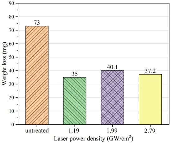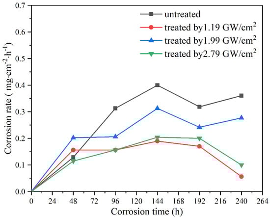 Figure 7 and Figure 8 show the corrosion rate and total weight loss of four samples immersed in SBF for ten days. According to the results of SBF immersion corrosion testing, the corrosion rate of the untreated sample increased linearly within 0–96 h and stabilized at 0.32–0.45 mg·cm−2·h−1 within the ensuing 96–240 h. Whereas, the corrosion rate of the samples treated with 1.19 GW/cm2, 1.99 GW/cm2, and 2.79 GW/cm2 increased within 0–48 h, and stabilized at 0.05–0.2 mg·cm−2·h−1, 0.2–0.32 mg·cm−2·h−1, and 0.05–0.2 mg·cm−2·h−1 in the subsequent 48–240 h, respectively. It worth noting that the corrosion rate of the untreated sample was lower than those of 1.19 GW/cm2 and 1.99 GW/cm2 in the initial stage of 0–48 h, which can be ascribed to a different area due to plastic deformation. Another total weight loss after ten days of untreated sample reached at 73 mg, while weight losses of 1.19 GW/cm2, 1.99 GW/cm2, and 2.79 GW/cm2 were for 35 mg, 40.1 mg, and 37.2 mg correspondingly. In terms of weight loss, the corrosion resistances of three samples treated by 1.19 GW/cm2, 1.99 GW/cm2, and 2.79 GW/cm2 wer improved by 52.1%, 45.1%, and 49%, respectively. Corrosion rate and weight loss of samples treated by laser shock peening were decreased compared with the untreated samples. Among them, the corrosion rate and weight loss of the sample treated with the parameter of 1.19 GW/cm2 were the lowest, followed by the one with the parameter of 2.79 GW/cm2 and the one with the parameter of 1.99 GW/cm2. That is in the same order as the residual compressive stress on the surface of each sample. It can be seen that the residual compressive stress on the surface induced by laser shock intensification shows a positive influence on corrosion resistance.