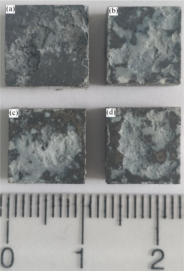 Macroscopic corrosion topography after immersion in SBF solution for ten days: (a) untreated; (b) 1.19 GW/cm2; (c) 1.99 GW/cm2; (d) 2.79 GW/cm2.