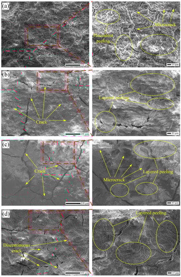 Figure 9 shows the macroscopic corrosion appearance of each sample after ten days. Broad and deep corrosion pits appeared on the surface of the original sample, and the corrosion behaviors are more severe in SBF. However, scattered and small corrosion pits appeared on the surface of the three specimens after laser impact. Meanwhile, it was noticed that the depths of pits of Figure 9b–d are less than in Figure 9a. Besides, many visible corrosion pitting pits can also be visually observed in Figure 9b–d. SEM diagrams of the corroded surface under the 100× and 500× lenses are presented in Figure 10. As can be seen in Figure 10a, when the magnification factor is 100×, it can be observed that there are many cracks and uneven places on the surface of the untreated sample with poor surface integrity. With further magnification to 500×, we can see the corrosion of the matrix morphology as numerous flocculent corrosion pits. Besides, too many micro-cracks have also been observed. Compared with Figure 10a, the three samples impacted by a laser had higher surface roughnesess and better surface integrity in the corroded area under the magnification factor of 100×. More importantly, by longitudinal comparison, we can see that the number of cracks on the surface of laser peening samples is significantly reduced under the same magnification factor (100×). The number of cracks on the corroded surface of the sample treated with the parameter 1.19 GW/cm2 is the least, and the large cracks are discontinuous. What is more, the microcracks have not yet broken the corrosion surface into small areas. In Figure 10c, the number of large cracks and micro-cracks increases significantly. Meanwhile, the area surrounded by the cracks was also small. In Figure 10d, a similar number of large cracks can be observed, as in Figure 10c. Still, these large cracks are discontinuous, and there are no tiny cracks, which proves that the sample can significantly inhibit the initiation and propagation of cracks due to residual compressive stress induced by laser shock peening. When enlarging the red area from 100× to 500×, we can see by longitudinal comparison that the corrosion morphology of three samples after laser shock peening is characteristically stratified, which is very different from the flocculent surface of untreated sample.