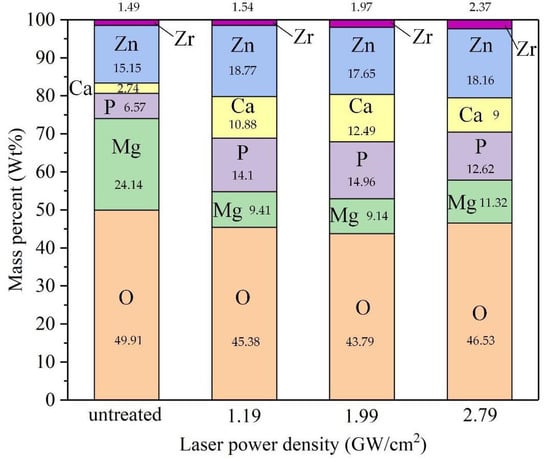 Corrosion surface elemental mass percentages from the EDS spectra results of the four samples are collected in Figure 11. The presence of oxygen and magnesium on the surface of all samples can confirm that the corrosion products are mostly Mg oxides. Compared with the untreated sample, the content of Mg on the corrosion surface of the three specimens after laser treatment is low, indicating that LSP improved the corrosion resistance of the sample in SBF. Thus, the oxidation product of magnesium was reduced. Simultaneously, the depositions of Ca and P elements on the corroded surface increased, which can further enhance biological activity and biocompatibility [].